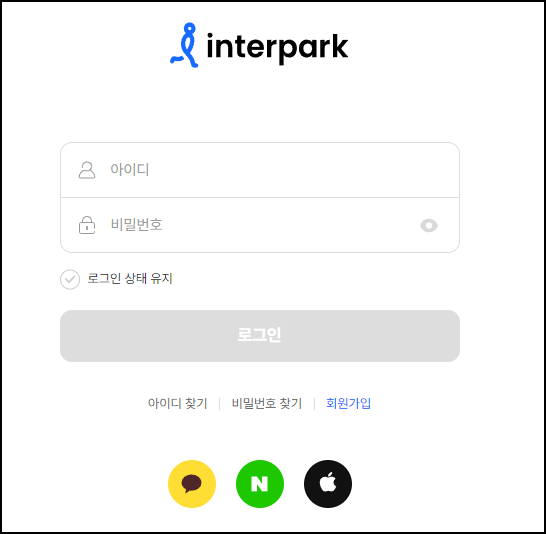 그럼 인터파크 로그인 창이 뜹니다. 카톡, 네이버, 애플 원하시는 방법으로 로그인을 합니다.